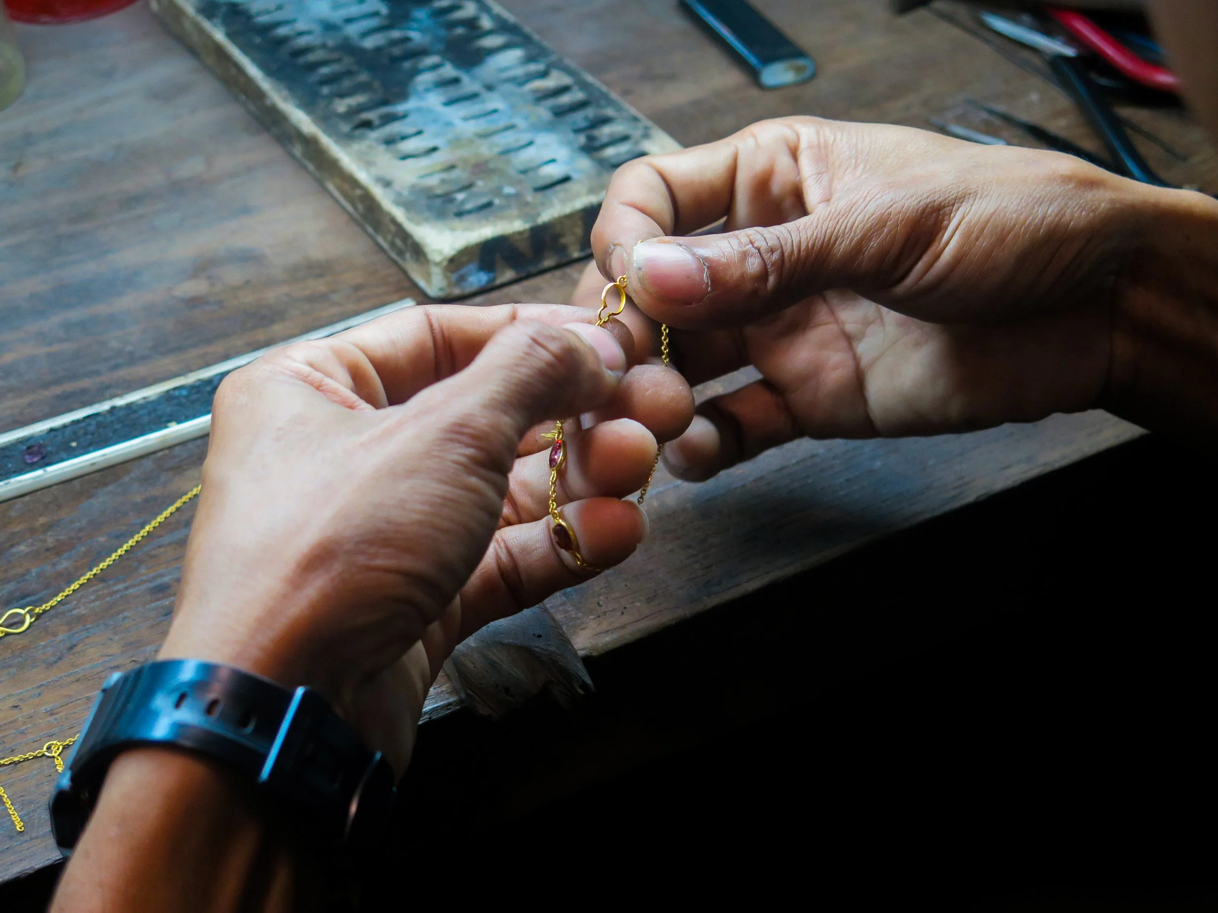 Decades of international isolation and sanctions have made Myanmar one of the poorest countries in Southeast Asia, with a third of the population living in poverty. Through artisan support, technical training, product development assistance, and business training, Turquoise Mountain is helping over 300 artisans across the country to generate sustainable incomes and support their families. Their apprenticeship programme is also supporting the next generation of goldsmiths in Yangon to learn from masters of the craft. By sourcing their stones directly from the women of the historic Mogok Valley, who hand cut them in traditional workshops, they are thus able to ensure a shorter supply chain.